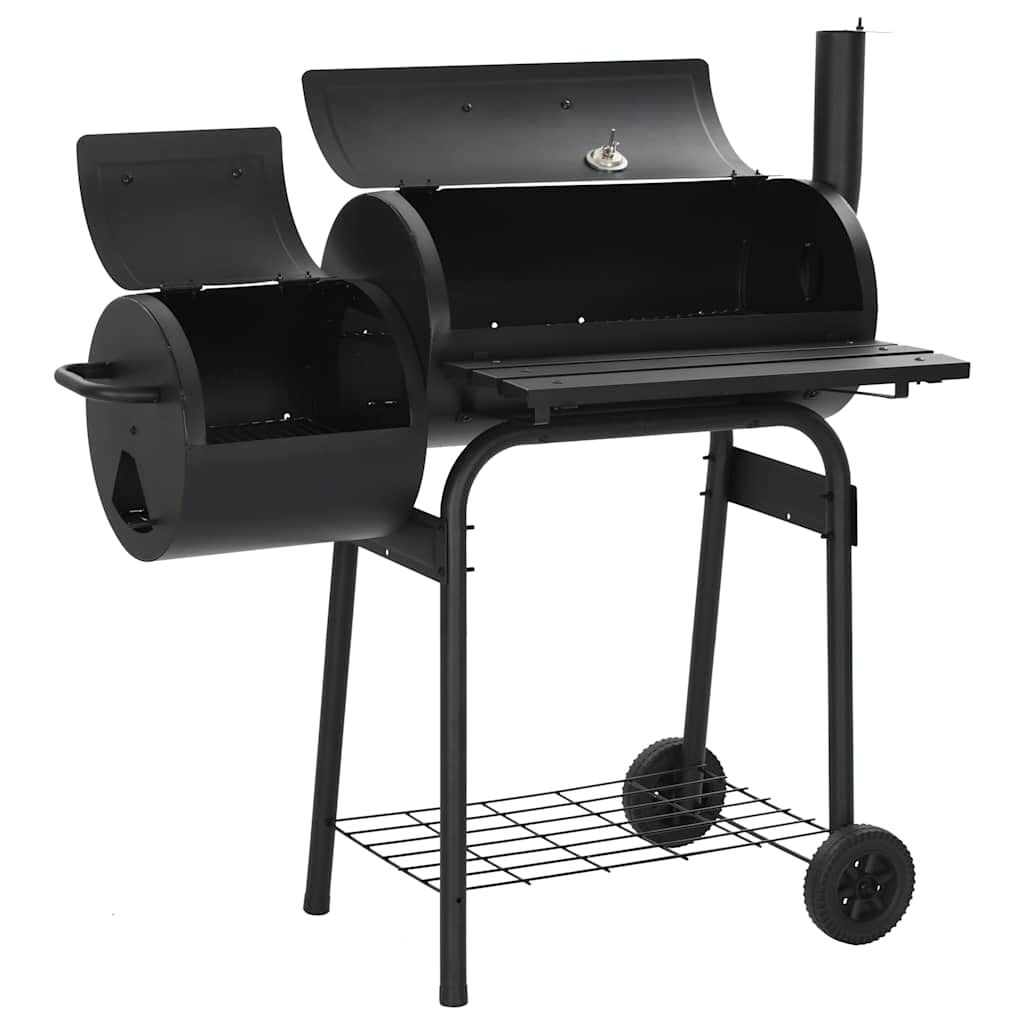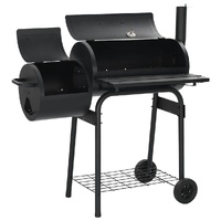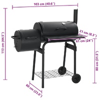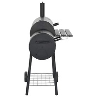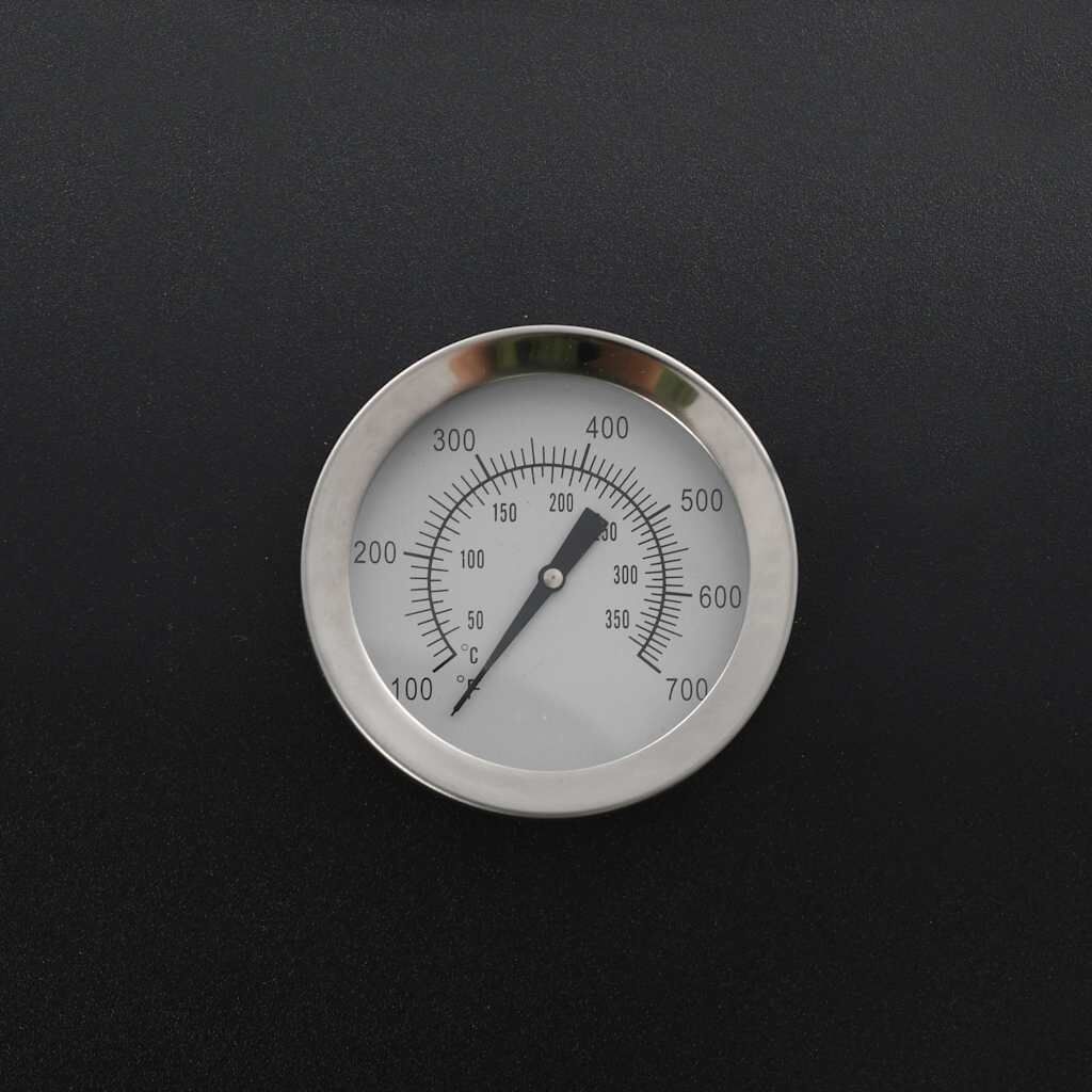 This smoker, consisting of generous cooking chamber and robust side firebox, allows you to conveniently grill, smoke and flavour your food. The perfectly sealed, thick metal body of the smoker ensures excellent retention and distribution of heat. The air outlets will help you adjust the air flow while the smoke stack damper controls the amount of smoke. Thanks to the integrated thermometer, you can observe and monitor the temperature. The smoker also contains a shelf in front and a storage shelf below where you can place spices, ingredients, utensils and other barbecue essentials. Equipped with 2 wheels, it can be easily moved around for outdoor parties, picnics and gatherings. Do not use the barbecue in a confined and/or habitable space e.g. houses, tents, caravans, motor homes, boats. Danger of carbon monoxide poisoning fatality.