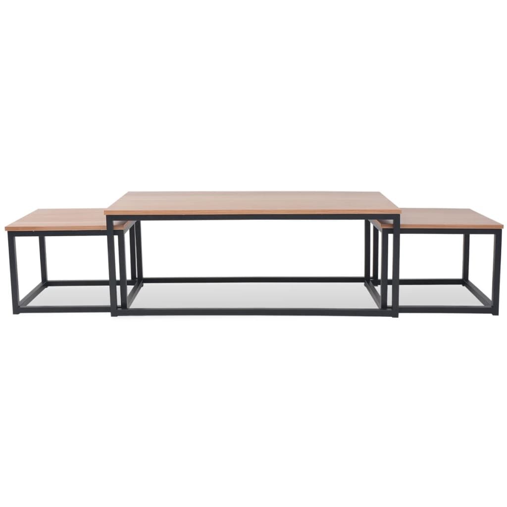 NOW $527.30This practical set of 3 coffee tables has a cool, industrial design and will make a great addition to your home decor. The tabletop is made of solid ash with an MDF veneer and is easy to clean with a damp cloth. The powder-coated steel frames make the tables sturdy and stable and add to their industrial style. The two smaller tables can be placed underneath the larger one to save space when they are not in use, which will also make for an interesting decorative effect. Assembly is easy. Delivery includes 1 larger coffee table and 2 smaller coffee tables.