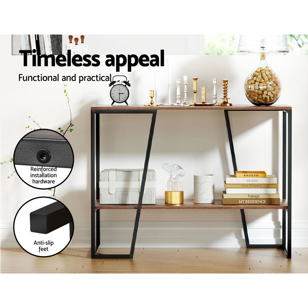 $90.20Looking for extra storage space in your living room or hallway? The industrial-style Cora Console Table is the ideal entry piece to welcome visitors, hold décor, and complete the look of your living room. Crafted from 15mm thick, sturdy particle board and anti-rust powder-coated black steel, the table is durable and designed to stand the test of time. The extra side bracket support keeps the table balanced and strong, giving the shelves a 30kg total weight capacity. 2-tier shelves give you plenty of room to store collectables, memorabilia, family portraits, or anything you see fit. Anti-slip feet keep the shelves in place so you never have to worry about slipping or scratching your floors, and the whole piece is simple to assemble and maintain so you can get to organizing right away. Get creative with your living space and enjoy the simple things with your new Cora Console Table.