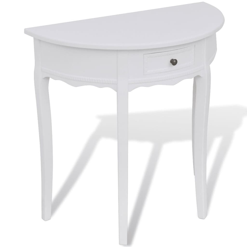 $293.39This sturdy and durable console table will make a great addition to your living room, dining room, or hallway. The table combines quality workmanship and functionality. Thanks to its compact design, our console table occupies very little space. The drawer provides you with additional space for your belongings. This durable console table is constructed from high-quality MDF and pine, and has a white paint finish.