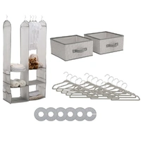This handy set includes 15 velvet hangers, 6 closest dividers, two small bins, plus a six-shelf hanging organizer. Each item is designed specifically for kid-sized stuff with a durable construction that can handle heavy use. Use the items in this set for baby clothes, burp cloths, bibs, socks, diapers, toiletries, and other nursery accessories. Purchase this set for your own baby's room or as a baby shower gift for someone else.