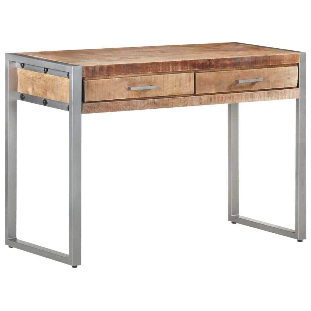 $251.99This industrial-style wooden desk exudes a vintage charm and will make a timeless addition to your home. The computer table is made of rough mango wood, a tropical hardwood with the strength to bear the weight. It also stands the wear and tear of time, making it stable and durable. The iron frame also adds extra stability. The wooden desk has two drawers providing ample space for storing small items such as keys, notebook, and other knick-knacks. The office desk can also be used as a writing desk or console table. Important note: Colours and grains may vary from piece to piece, making each piece unique. The delivery is random, ensuring the exclusivity and individuality of your product.