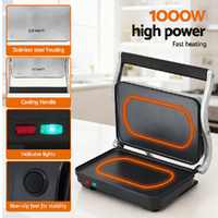 The non-stick plates allow healthier cooking with minimal oil and are easy to clean — just wipe with a damp cloth. A large grill plate fits up to two sandwiches at once, ideal for families or roommates. Safety is ensured with a cool-touch handle and non-slip feet, while the stainless steel housing adds durability and a modern look.