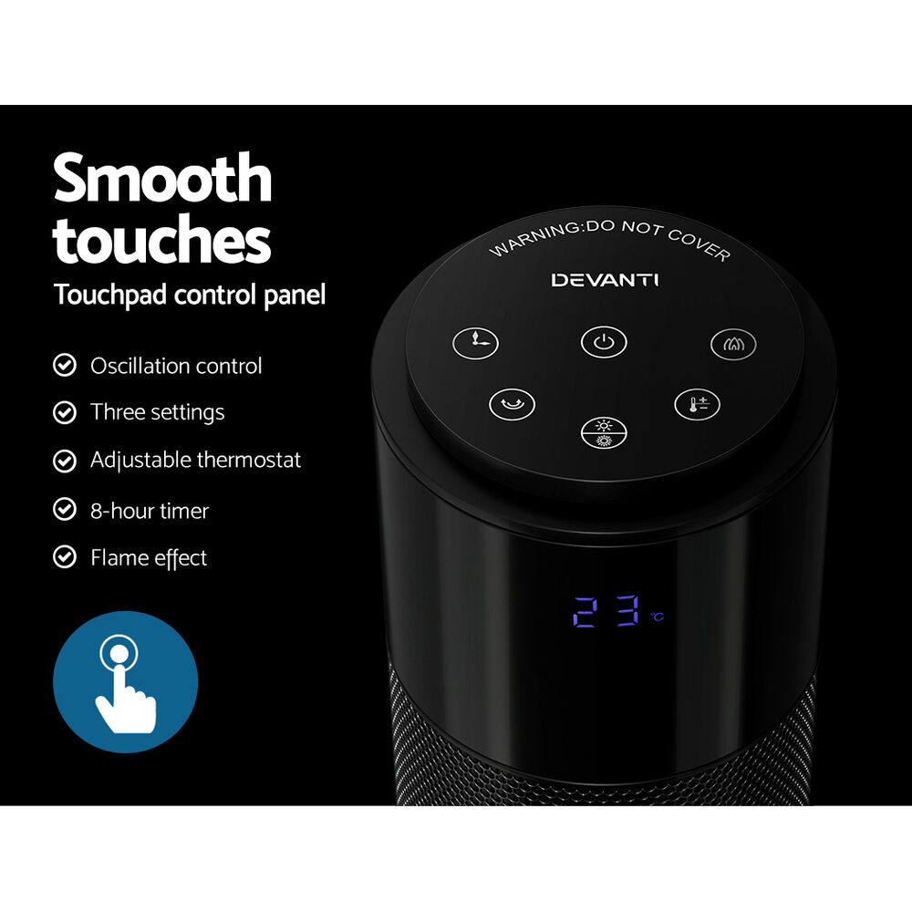 Need a little extra heating to get through winter? The Devanti Ceramic Tower Heater is here to solve your winter blues. With its high-quality rapid PTC heating system and fan system, the heater will have you warm in no time at all. It has three unique modes (fan, warm air and hot air) so you�re always at the perfect temperature. It uses wide-angle oscillation to evenly heat your space and features an aesthetic 3D flame effect to mimic the ambience of a real fire without the risk. Easily control the heater with the top touch control panel: adjust the thermostat, oscillation and heating mode at any time. Use the eight-hour timer with auto shut-off to strategically heat your home and save energy. Best of all, the heater has built-in safety features such as an anti-scald protective mesh, a safety cut-off switch in case of tipping and overheating protection. For maximum comfort and warmth through the winter months, you can�t go wrong with a Devanti Ceramic Tower Heater.
