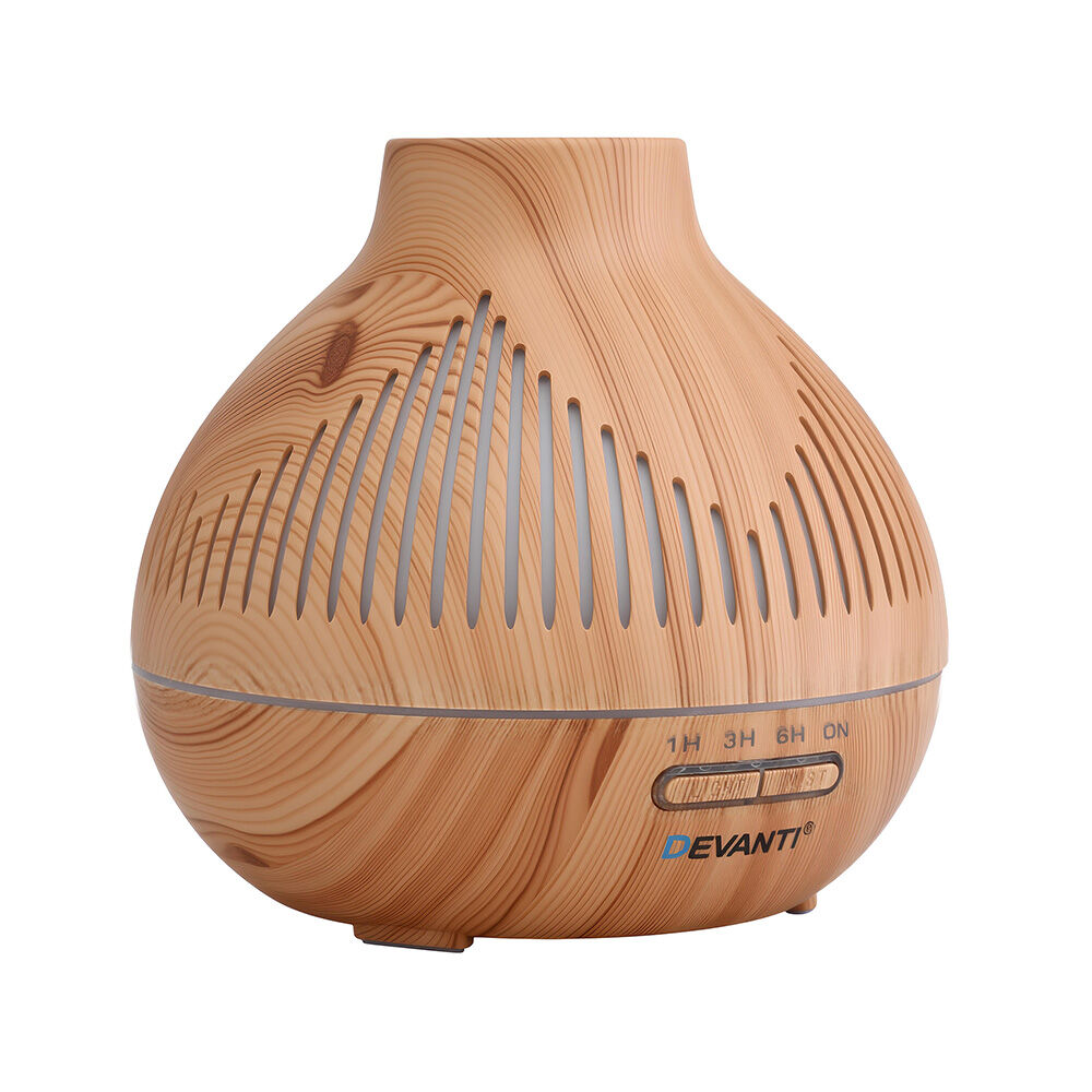Add a touch of nature to your home with this wood grain aroma diffuser. Featuring a 400ml tank, 3 mist modes, and 3 timer settings, it creates a relaxing atmosphere with your favorite essential oils. Cycle through 7 LED colours with 2 brightness levels to set the perfect mood day or night. Whisper-quiet operation, automatic shut-off when water runs low, and low energy consumption make it safe and convenient for daily use. Perfect for bedrooms, living rooms, offices, or as a thoughtful gift.