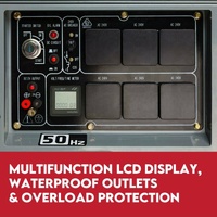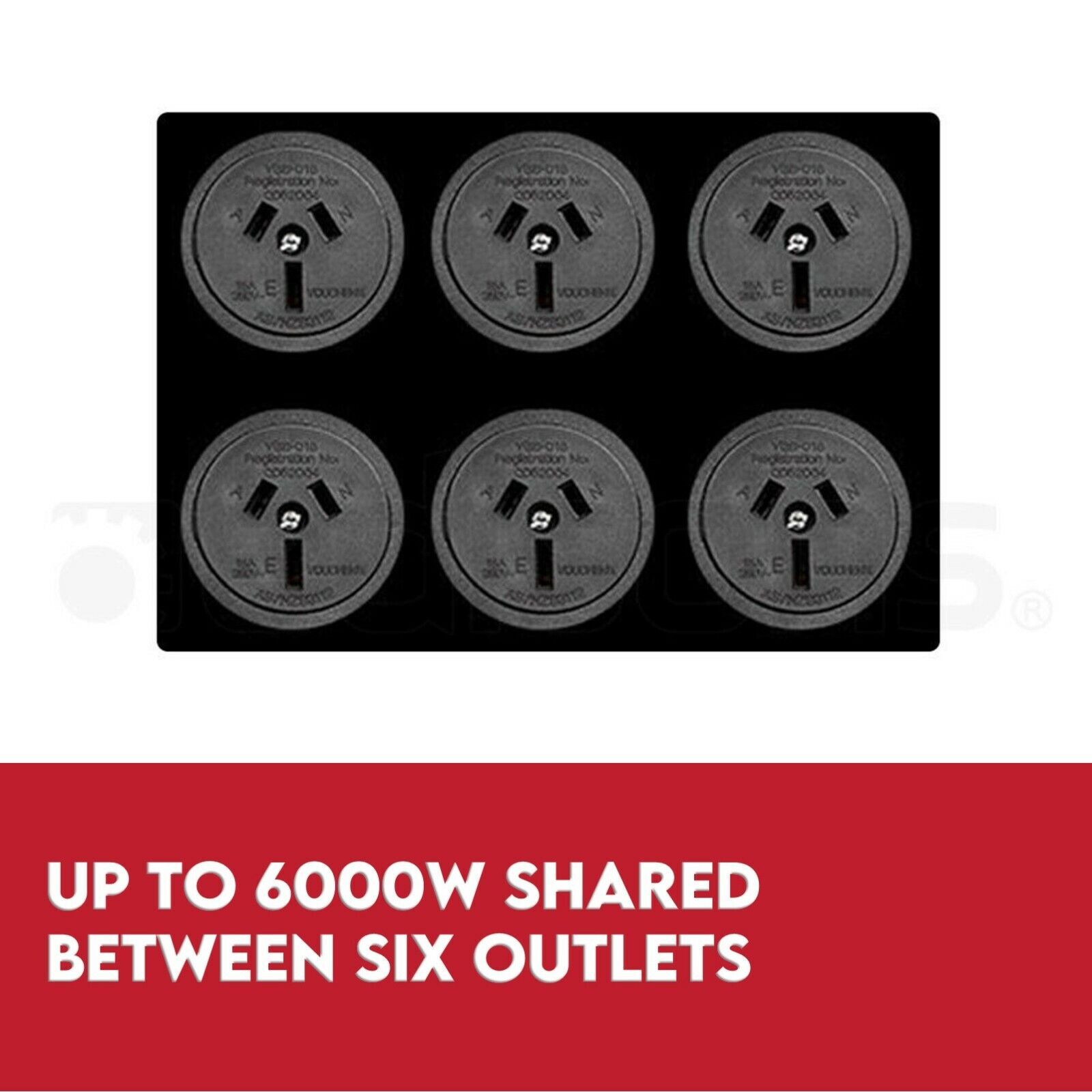 It features 6x 240V AC outlets, a 12V DC battery-charging outlet, and an 8.3amp 12 volt DC outlet. It could comfortably run a range of tools, white goods and lighting.