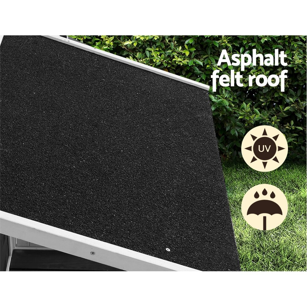 Give your beloved pets a safe and comfortable home to sleep, relax and play with an i.Pet Pet Kennel. Made from solid natural Fir wood with a UV-resistant asphalt roof, the kennel is weatherproof and built to last all seasons, all year round. The angled roof allows for proper drainage during wet weather, and the raised floor and elevated base keep the kennel well-ventilated to prevent mould and odour build-up. Rubber feet keep the kennel firmly in place no matter where you place it. The outdoor awning with steel bars and a door, providing a secure place for your pet to relax. Two entry and exit point provide easy access for your pet and easy cleaning for you. Easy to install and maintain anywhere in and out of the home, the i.Pet Pet Kennel is the perfect home for your furry friend.