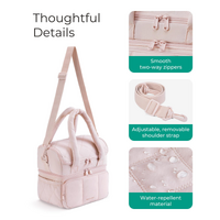 Stay organized and keep your meals fresh wherever you go with this double-layer insulated lunch bagengineered for performance, comfort, and everyday style. Designed with a smart two-compartment layout, it separates dry snacks from liquids or chilled items to prevent leaks and maintain food integrity. The leak-proof bottom section is ideal for drinks, yogurt, or meal prep containers, while the top zone keeps fruits, sandwiches, and dry goods secure and easily accessible. Built with 5mm EPE foam insulation and a food-grade PEVA interior lining, this cooler tote effectively maintains temperaturekeeping cold foods cool for up to 12 hours and warm dishes cozy for up to 6 hours. Lightweight yet spacious, it holds up to 11.8 liters, fitting full-sized containers, multiple beverages, and side dishes with room to spare. Smooth dual-zipper openings offer full 180 access, while thoughtful pocketsincluding a front zip compartment, interior mesh slot, and two stretchy side sleeveskeep utensils, napkins, ice packs, and water bottles neatly in place. Whether you're commuting to work, heading out for a picnic, or traveling, this reusable lunch bag blends practicality with modern aesthetics for a smarter way to carry your meals.