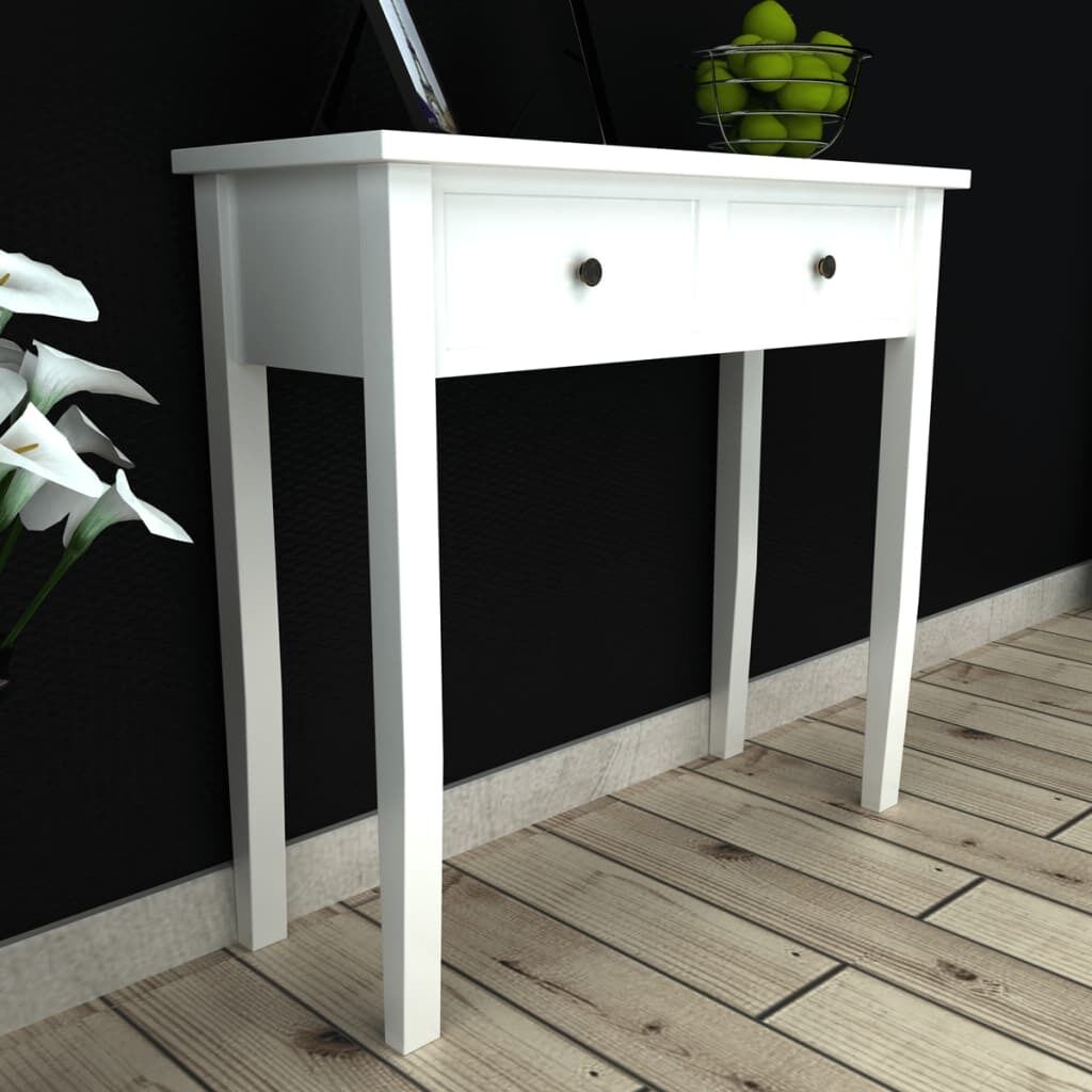 Our console table, featuring a simple yet timeless design, will surely make a great addition to your living room, dining room, hallway, and more. The table features excellent workmanship combined with great functionality. Thanks to its compact design, our console table occupies very little space and fits into smaller areas. Two smooth-rolling drawers offer you additional space for your ornaments, cosmetics and other private belongings. This dressing table is constructed from high quality MDF and pinewood with white painted finish for durability, which gives you years of service.