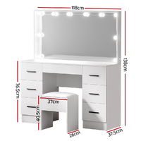 $272.48Feel like a star straight out of Hollywood with the Artiss Debbie Dressing Table. Packed with generous storage and other convenient features, your new beauty routine will be a breeze. Made from quality MDF particleboard with a melamine finish, the table is built to last. The Hollywood-style acrylic makeup mirror is surrounded by bright LED bulbs for the perfect illumination. Choose from warm, neutral and daylight white light so you can always look stage-ready. Seven generous storage drawers with sleek handles open smoothly on anti-rust runners, giving you instant access to your beauty essentials. A foam-padded PU leather stool allows you to sit comfortably while applying make-up or skincare and can be neatly tucked away when not in use. Easy to install and even easier to maintain, you'll love getting ready for the day in front of your new Artiss Debbie Dressing Table.