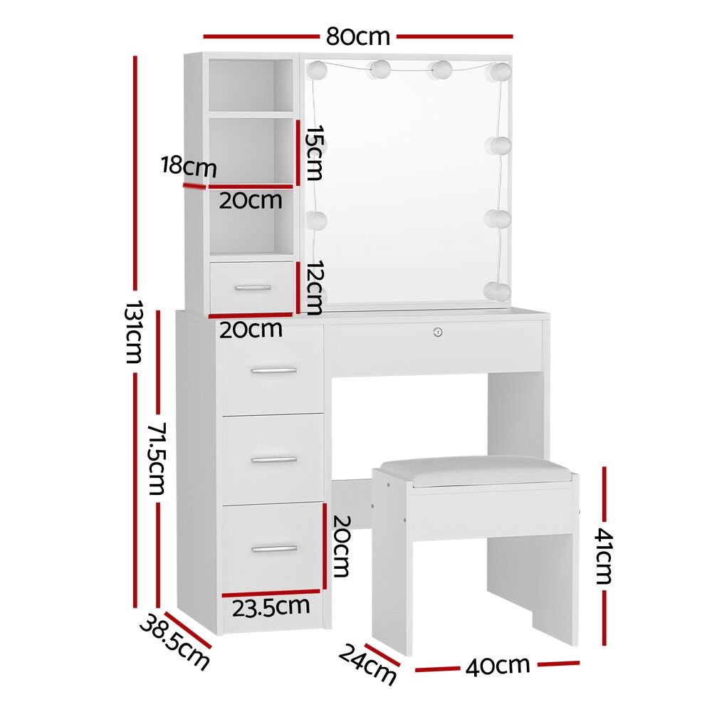 $196.19Feel like a star straight out of Hollywood with the Artiss Dylan Dressing Table. Packed with generous storage and other convenient features, your new beauty routine will be a breeze. Made from quality MDF particleboard with a melamine finish, the table is built to last. The Hollywood-style makeup mirror is surrounded by bright LED bulbs for the perfect illumination. Choose from warm, neutral and daylight white light so you can always look stage-ready. The vanity features three open shelves that you can use to display trinkets or beauty products. Five generous storage drawers with silver handles open smoothly on anti-rust runners, giving you instant access to your beauty essentials. A foam-padded PU leather stool allows you to sit comfortably while applying make-up or skincare and can be neatly tucked away when not in use. Easy to install and even easier to maintain, you'll love getting ready for the day in front of your new Artiss Dylan Dressing Table.