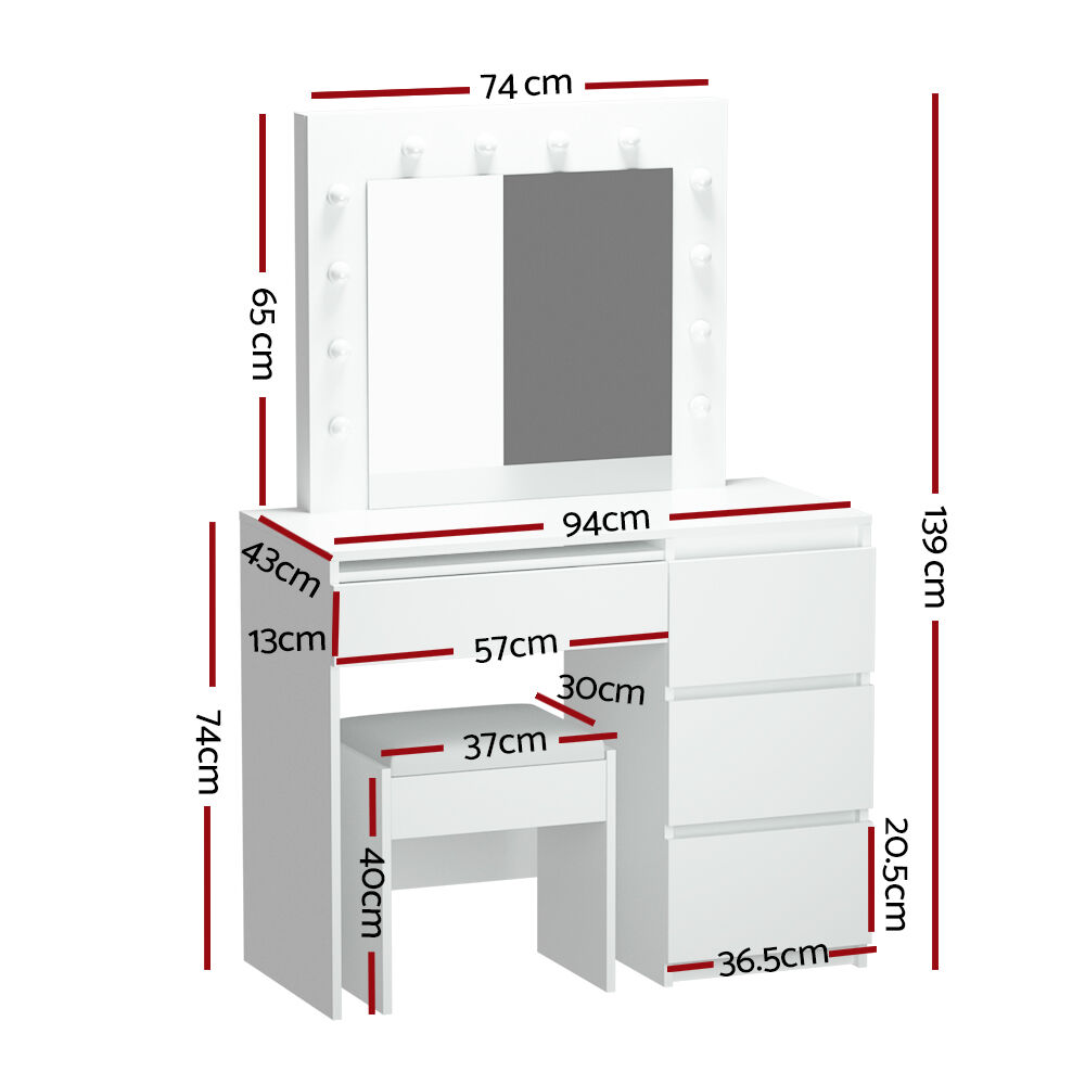 $191.57Add a touch of Hollywood glamour with the Artiss LED dressing table. It will help you achieve a flawless and well-groomed look that you'll love. With its illuminated mirror, getting ready can become less chaotic and help you put your best self forward. The LED dressing table comes with 12 LED bulbs for better illumination and clarity. It has three colour options - neutral white, warm white, and daylight white, allowing you to choose the best lighting for detailed makeup. You can even adjust the brightness to get the right look and flawless finish. This dressing table features four spacious drawers. No matter how many makeup products you have, they're sure to fit in the available space. You can group and organise your makeup essentials in each drawer, so you never struggle to find them. Our dressing table also has a soft padded stool upholstered in PU leather. It’s well-constructed for your comfort and long-lasting use. Furthermore, our LED dressing table is made using an eco-friendly particle board frame with a melamine finish. It's quite sturdy and has smooth finish edges, which makes it safe to use. Not least, the dressing table is easy to clean. Just a simple wipe with a dry cloth is enough.