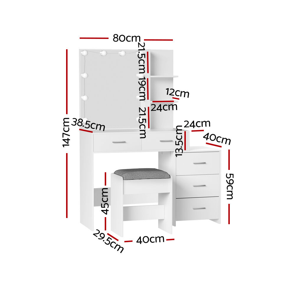 $191.57Feel like a star straight out of Hollywood with the Artiss Dale Dressing Table. Packed with generous storage and other convenient features, your new beauty routine will be a breeze. Made from quality particleboard with a white melamine finish, the table is built to last. The Hollywood-style makeup mirror is surrounded by bright LEDs for the perfect illumination. Choose from warm, neutral and daylight white light so you can always look stage-ready. The adjustable side chest features open shelves that you can use to display trinkets or beauty products. Five generous storage drawers give you instant access to your beauty essentials. A foam-padded PU leather stool allows you to sit in comfort while applying make-up or skincare and can be neatly tucked away when not in use. Easy to install and even easier to maintain, you'll love getting ready for the day in front of your new Artiss Dale Dressing Table.