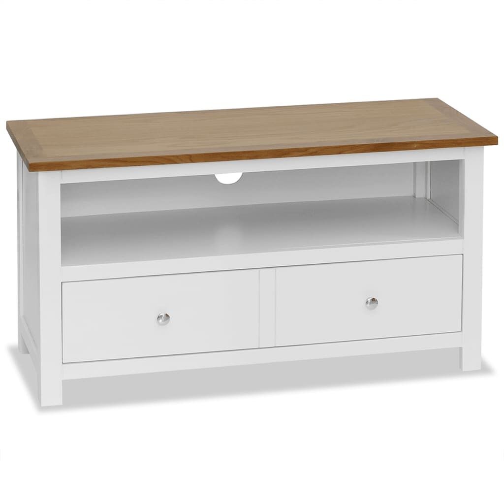 $174.83Our two-tone wooden TV cabinet will give your home decor an elegant touch with its timeless design. This TV unit has a solid oak top, which adds to its sturdiness and durability. The oak has beautiful wood grains that exude a natural charm. The body is made of solid pinewood with a white finish and boasts a contemporary style. The TV stand has 1 drawer and 1 compartment, providing ample storage space for your multimedia appliances, books and other items. Thanks to the slot at the back, you can hide the power cords behind the cabinet to keep them out of sight. This product needs assembly.
