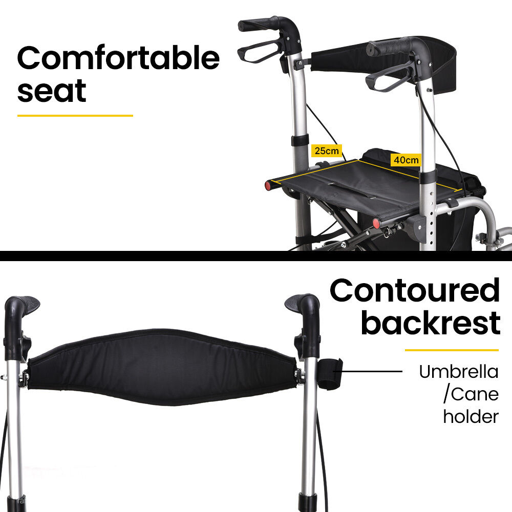 Large 8" PVC wheels allow the walking frame to roll smoothly over the bumps on a range of surfaces, and the soft rubber tread provides grip both inside and outside. The height adjustable handles offer a highly ergonomic design and feature easy-squeeze dual action brakes. Pushing down on the brake levers activates the park brakes, enabling you to take advantage of the stable seat to rest and watch the world go by.