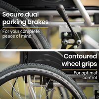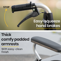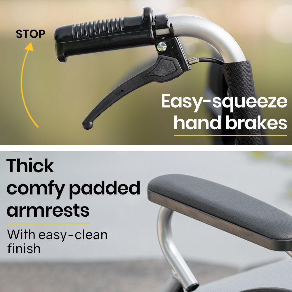 This premium lightweight wheelchair features fold up footrests allowing for access onto the wheelchair. The comfy padded seat and generously proportioned backrest ensure a comfortable ride. And, thanks to the 2 second folding action and ergonomic handles, it makes for a relaxing day out for any helpers, too! They can activate the easy access dual brakes to safely go down hills and ramps, while dual parking brakes can lock the wheels into position a perfect time to pull out some reading material from the backrest pouch!