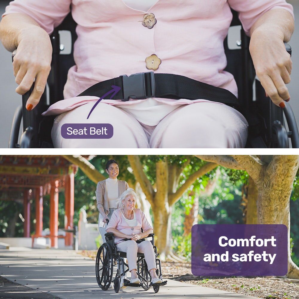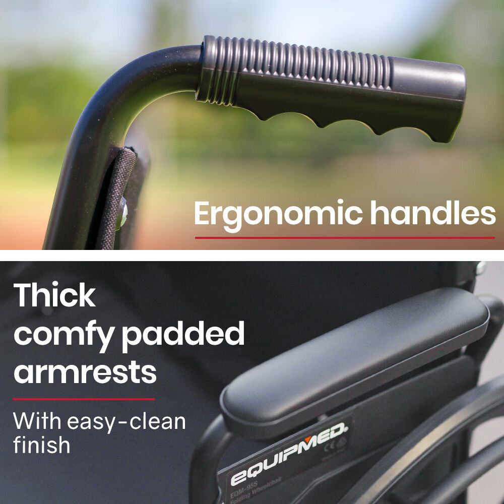This Equipmed wheel chair features height adjustable footrests that also swing out for easy access onto the wheel chair. Combined with a generous 51cm seat width, the comfy padded armrests and a padded seat with generously proportioned backrest ensure a comfortable ride. The armrests have quick release levers which allow them to swing back to allow for convenient access at tables when dining. And, thanks to the 2 second folding action and ergonomic handles, it makes for a relaxing day out for any helpers, too!