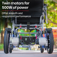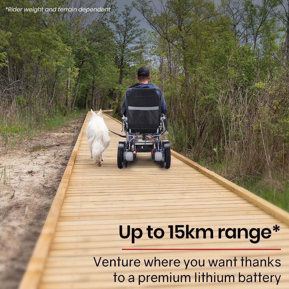 Twin motors offering a total of 500 watts offer an enjoyable riding experience with smooth and responsive performance, not to mention the ability to climb hills and ramps right up to a 15-degree incline! A tight 1m turning circle offers the manoeuvrability you need on paths and in places like shopping centres and airports.