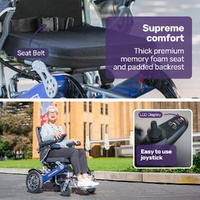 This Equipmed electric wheelchair has many features built-in; Seat Belt, Anti-tip Wheels, Dual Park Brake, and Smart Speed Control which regulates the speed when going downhill. The high-quality frame means that it can accommodate a 130kg rider weight.