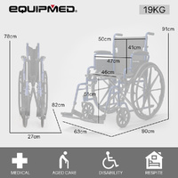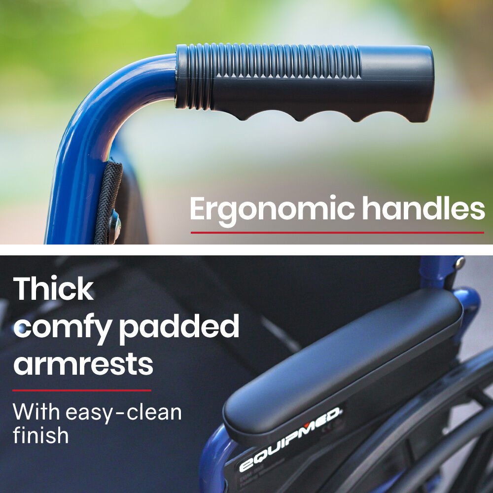 This Equipmed wheel chair features height adjustable footrests that also swing out for easy access onto the wheel chair. Comfy padded armrests and a padded seat with generously proportioned backrest ensure a comfortable ride. The armrests have quick release levers which allow them to swing back to allow for convenient access at tables when dining. And, thanks to the 2 second folding action and ergonomic handles, it makes for a relaxing day out for any helpers, too!