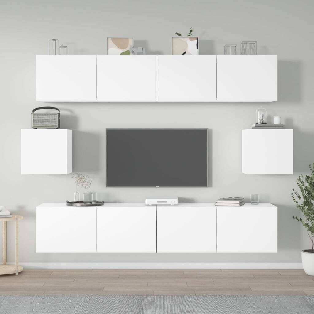 $279.92This classic TV cabinet set is designed to be a focal point of your room, featuring a trendy yet practical design. Sturdy material: The engineered wood is of exceptional quality with smooth surface and also features strength, stability and resistance to moisture. Made of engineered wood, these TV stands are easy to clean.Ample storage space: These TV units provide ample storage space to keep all your magazines, DVDs and any other items well organised.Wall-mounted design: The media cabinet doesn't take any floor space. You can hang it on the wall easily.Practical doors: Keep your essentials free from dust by hiding them behind the door of the media unit. Note:Screw(s) and plug(s) for inside the wall are not included. Seek and use screw(s) and plug(s) suitable for your walls. If you are uncertain, seek professional advice. Read and follow each step of the instruction carefully.Each product comes with an assembly manual in the box for easy assembly.