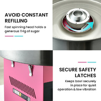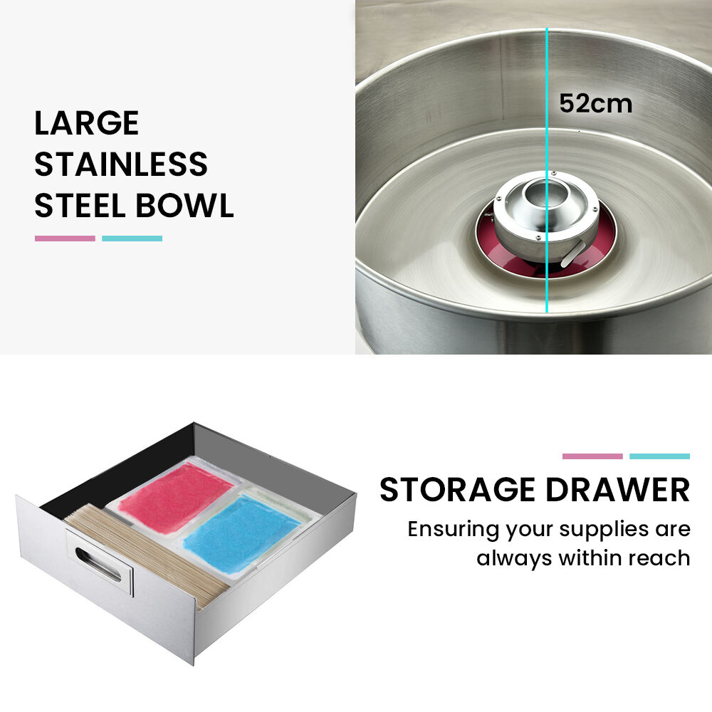With the universal appeal of fairy floss, it’s an easy sell at community events, fairs, and markets. With its robust design and simple operation it’s also an option to hire it out for kids parties. The Eurochef has all the features you need. The handy storage drawer ensures that your supplies are always within reach. Its fast spinning head holds a generous 114 grams of floss sugar so you can avoid frequent refilling, and its removable stainless steel bowl makes cleaning and maintenance easy at the end of the day. Secure safety latches and rubber feet keep the bowl and machine securely in place to minimise vibration!