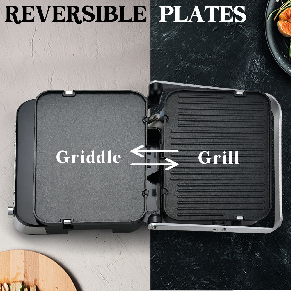 Each of the non-stick cook plates is reversible, offering you the choice of a ribbed or flat cooking surface. You can opt for the ribbed grill plate when cooking your chicken meals, fish or toasting a panini, or you can go with the flat griddle side when cooking up sausages or eggs for breakfast.