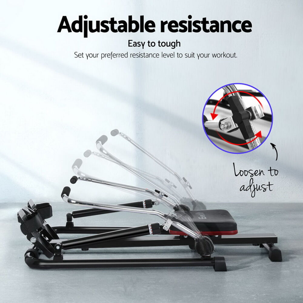 $183.34Want all the gym gains without gym prices? Get yourself a state-of-the-art Rowing Machine from Everfit. Made from a sturdy steel glide rail with an oil cylinder system, the machine targets all the major muscle groups for a full-body workout. Simply select the workouts you desire with up to 12 resistance levels and monitor your progress on the large LCD display console. The adjustable large footrest and comfortable moulded seat ensure maximum comfort while exercising. With a weight capacity of up to 200kg, the Rowing Machine is no pushover in terms of strength and durability. With its quiet operation, sturdy frame and anti-slip stand, the machine is the perfect addition to your home fitness routine. When the huffing and puffing is done, simply fold it and store it until the next session. Go for it with the Everfit Rowing Machine today!