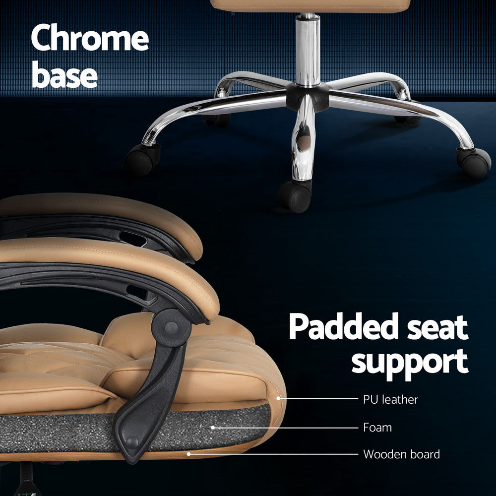 $151.58Is your office chair giving you a tough time? Stay productive and work feeling comfortable with our Artiss Camelon office chair. The office chair that makes work feel laid back. The more comfortable chair, the higher is the productivity. Our office chair is designed with your comfort in mind and will have your back so that you can focus on the more significant things. Crafted precisely with solid plywood material and PU leather and PVC upholstery, the office chair is sturdy and comes with a high-density foam padding and plush polyester filling. Furthermore, the stylish chrome base is not to be missed. It also features a contoured high-back design that will give you the support you need and help you have a better posture. Plus, the office chair can be adjusted to your preferred requirements; adjust the height with gas lift mechanism to suit your needs, 90 degree to 135 degree reclining seat for a comfortable sitting position, 360 degree rotating seat, adjustable padded armrests, and easy mobility around your workspace with smooth castor wheels. Contemporary and well-crafted, our Artiss dual padded seat and back Camelon office chair is sure to offer you a super comfortable seat all day long. Add this office chair to your home office or study room. You are sure to fall in love with the comfort it offers.