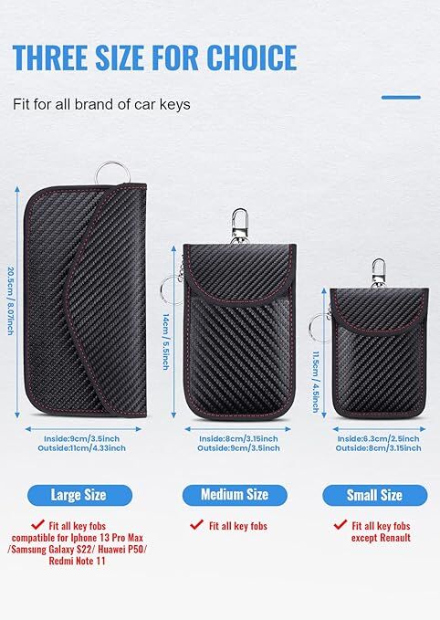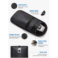 4.[ 2 PACK CARBON FIBER FARADAY BAGS ] The size of the car key signal blocking pouch is 3.5 x 5.5inches / 9 x14 cm, easy to carry. Accommodates multiple sizes of keychains and small devices. Includes 2 medium fob key protectors in each package so that you can protect your spare key fob or multiple vehicles in your household.