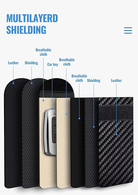 1.[ RFID KEY FOB PROTECTOR ] This car faraday pouch for car keys can protect your car effectively. faraday bags protect your belongings from EMF, RFID, and other hacking signals! Effectively stopping your keyless entry fobs from being remotely accessed.No worry about thieves amplifying your fob signal and opening the car anymore.