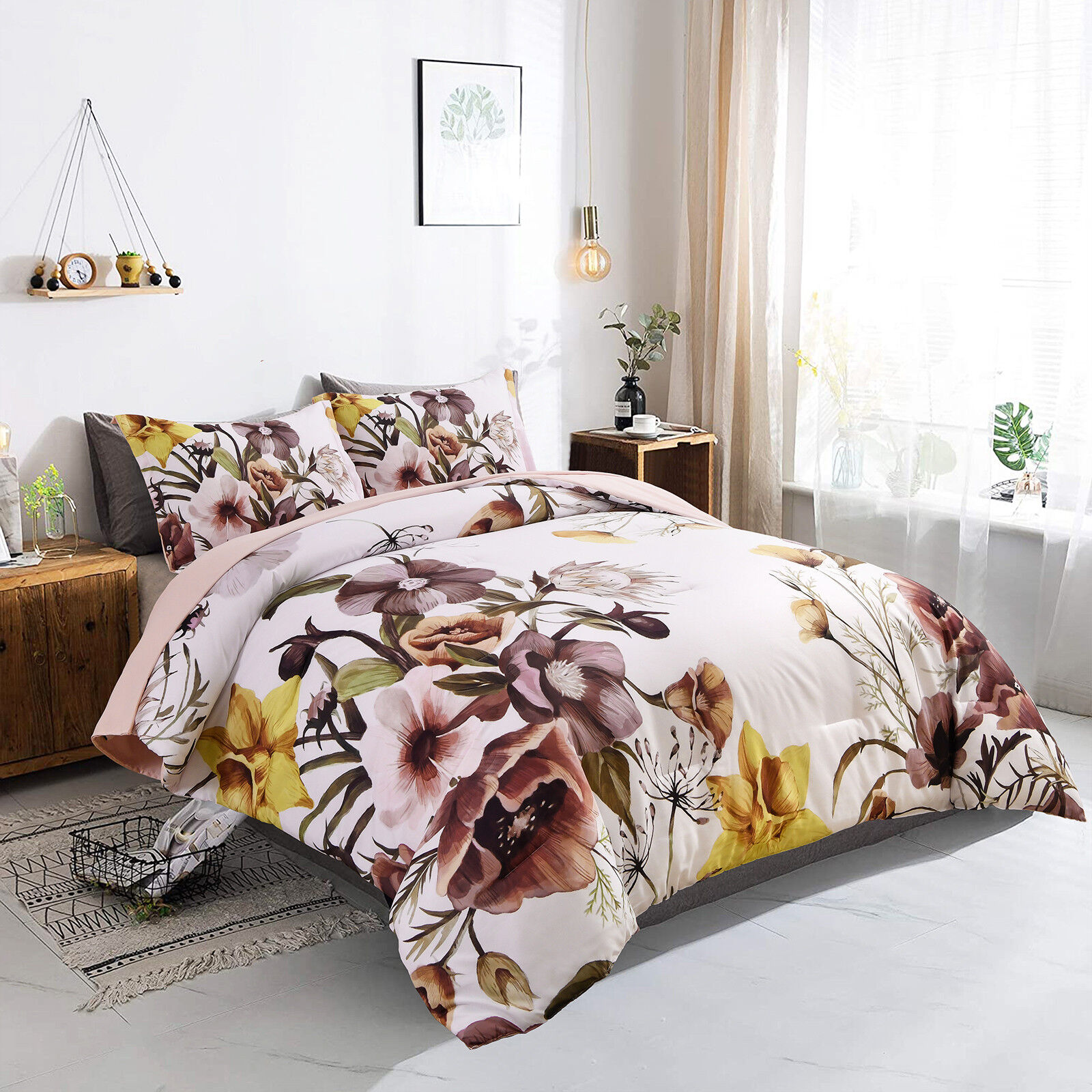 Floral Comforter Set, King Size, Blush Floral 3-Piece Bedding, Soft Microfiber for All Seasons