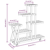 This wooden flower stand is a perfect choice to place and display your plants and other decorative items. Durable fir wood: This plant stand is made of fir wood, which is sturdy and durable, ensuring years of service. Additionally, since carefully carbonised craftsmanship, this wooden flower display stand has excellent performance on moisture-proof ability and weather resistance.Ample space: This plant rack offers sufficient space for displaying your plants and other decorative items.Wide applications: Featured with natural carbonized colour and wood texture, this wooden planter rack brings decorated places a touch of retro and elegant feel. What’s more, the symmetric appearance will match different decoration styles, such as living room, balcony, patio.Considerate wheels: With 360-degree rotatable castors, the plant shelves on wheels can be moved around flexibly.