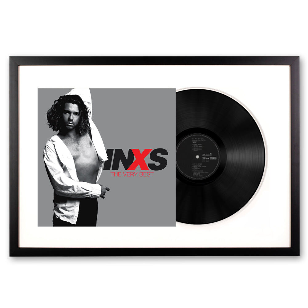 Framed INXS The Very Best - Double Vinyl Album Art - We are eager to honour and showcase this art form by framing the actual original artist's vinyl cover and vinyl record themselves. This record is framed using all wood profiles, archival matting, and UV-filtering non-glare acrylic. The cover artwork is presented in full, while the actual vinyl peeks out of the sleeve. The outer dimensions of each frame are 75 cm x 47.5 cm.