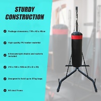 The punch bag stand features dimensions of 218 x 165 x 165cm (H x D x W). It features an all-steel frame for exceptional durability and stability. Assembly is straightforward, and everything you need is included.