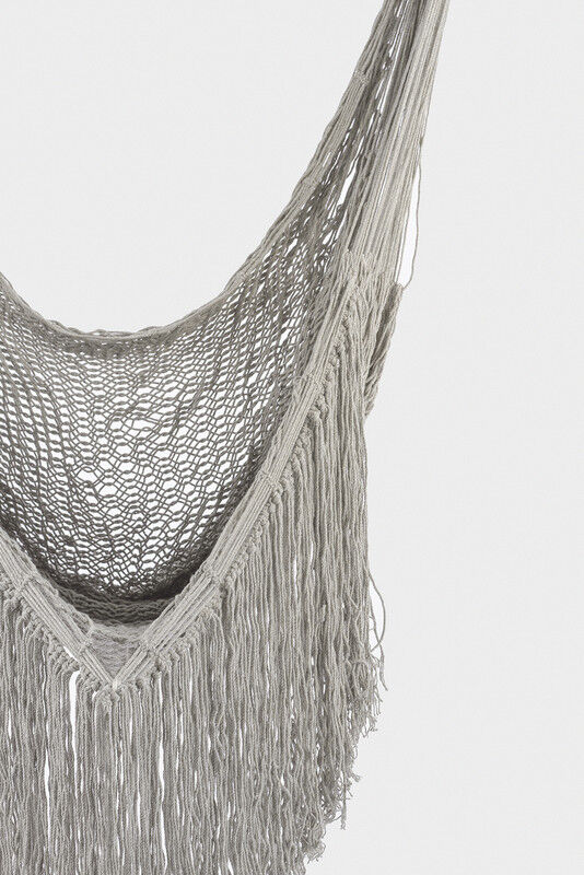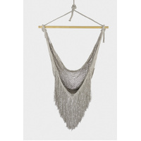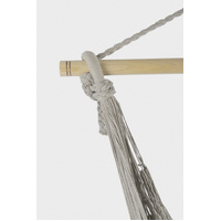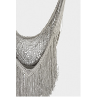 Indulge in pure relaxation with this stunning hammock swing. Crafted with 100% cotton rope in our Dreams Sands catalog color, this elegant gray rope hammock is adorned with a luxurious fringe, making it the perfect addition to any space.