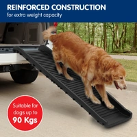 This strong, durable ramp with an anti-skid surface is designed to help your pet easily get in and out of vehicles or reach high areas. Small dogs, like Chihuahuas, can injure themselves by jumping from chairs or beds due to the stress on their leg bones. This PP ramp provides a safer, easier way for older or smaller pets to access vehicles, reducing strain on joints and back. The anti-skid surface ensures stable footing, while the ramp folds in half for convenient transport. It also features a safety latch to prevent accidental unfolding.