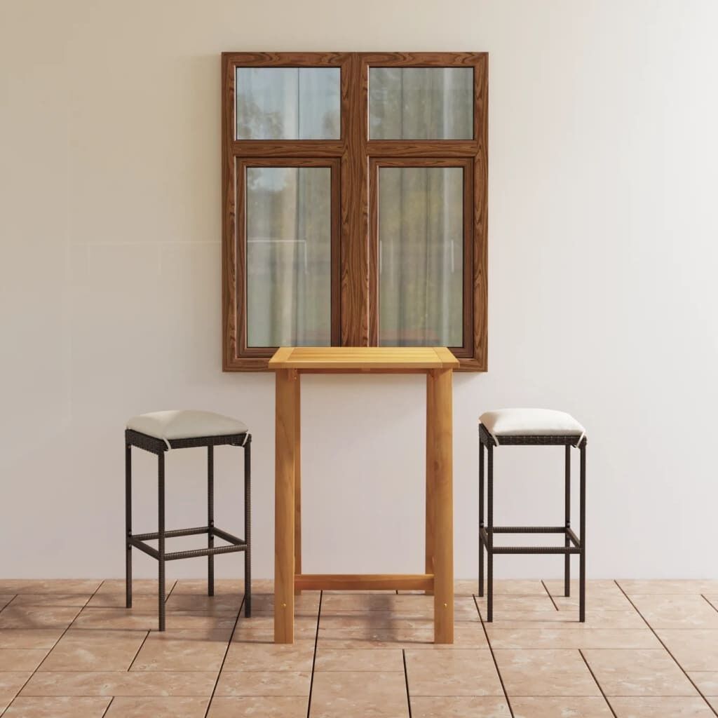 $265.97This garden bar set has an elegant design and is the focal point of your garden, patio or terrace. The table is made of solid acacia wood with an oil finish, which makes it stable, durable and easy to maintain. Featuring a powder-coated steel frame covered with weather-resistant PE rattan, the bar stool is sturdy and easy to clean. The thick, removable seat cushions are highly comfortable. The cushion covers with zippers can be easily removed and washed. Note: We recommend covering the set during rain, snow and frost.