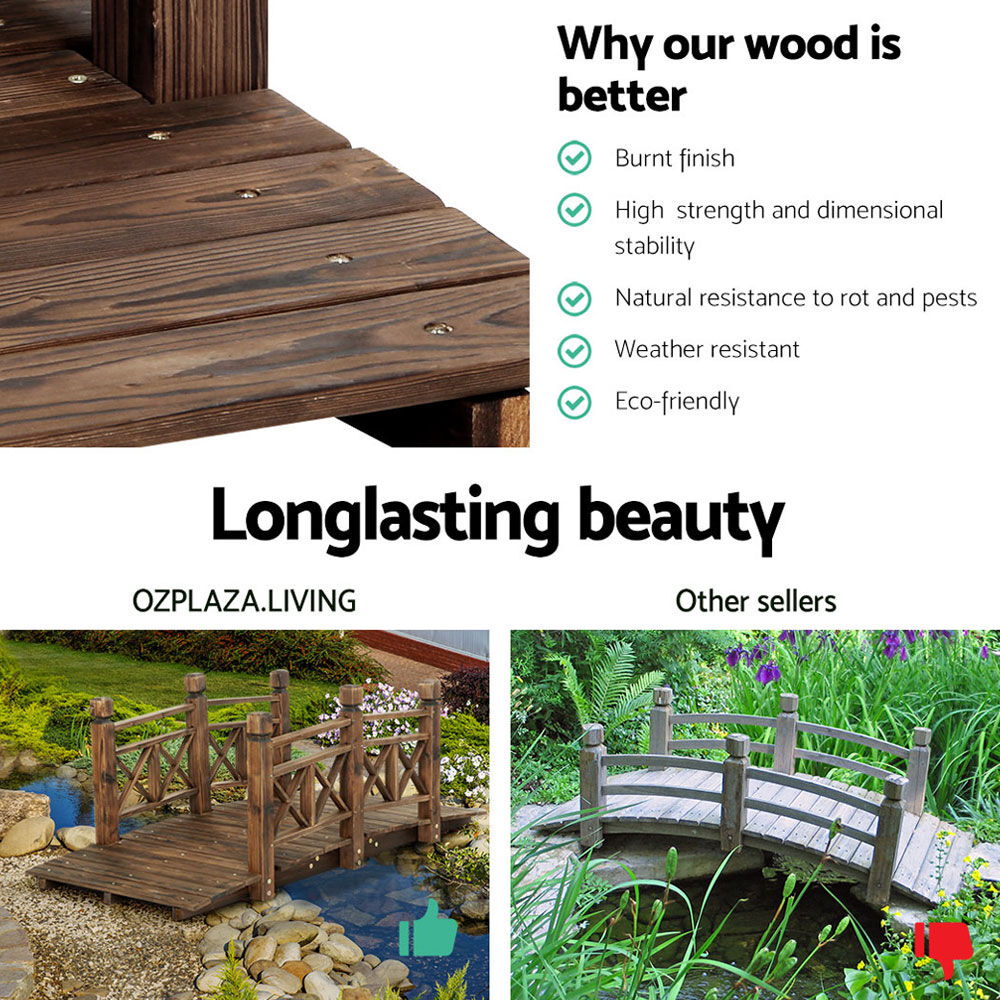 NOW $131.08Enhance the look of your garden with our beautiful Gardeon wooden garden bridge. It makes an elegant upgrade. Featuring classic arch design with sculpted side railings, our wooden garden bridge will provide both decorative and functional appeal. It’s crafted from burnt-finished, solid fir wood that helps you achieve a rustic look for your garden and ensures sturdiness and durability. The extra thick 3-ply solid timber bottom gives the wooden bridge extra strength, support, and stability. Additionally, its solid construction makes the bridge capable of handling weight up to 200kg. So rest assured that this bridge will withstand the rigours of everyday use. Our Gardeon wooden garden bridge also offers natural resistance to rot and pests, and its weatherproof design makes it ideal for outdoors. Shop our Gardeon wooden garden bridge to give to garden a rustic and classic look and feel.
