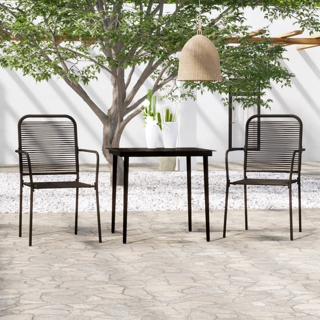 This trendy dining furniture set featuring elegant design and clean lines is an excellent choice for your garden, patio, terrace, kitchen and even dining rooms. The simplistic elegance of this dining set makes your everyday dinner special. This garden dining set features a powder-coated steel frame that makes the table and chairs stable and durable. The backrest and seat are made of twined cotton rope, which is soft to touch and sturdy for long term use. Additionally, the table features a tempered glass tabletop, which is easy to clean with a damp cloth and perfect for placing meals, drinks and other decorative items. Note: In order to extend the life of your outdoor furniture, we recommend you to clean it regularly and do not leave it outdoors without protection unnecessarily.Clean: Use a mild soap solution.Storing: If possible, store in a cool, dry place indoors. If the product is stored outdoors, protect it with a waterproof cover. Wipe and dry the excess water or snow from flat surfaces after a rain or snowfall. Allow sufficient air circulation to avoid moisture-related damage.