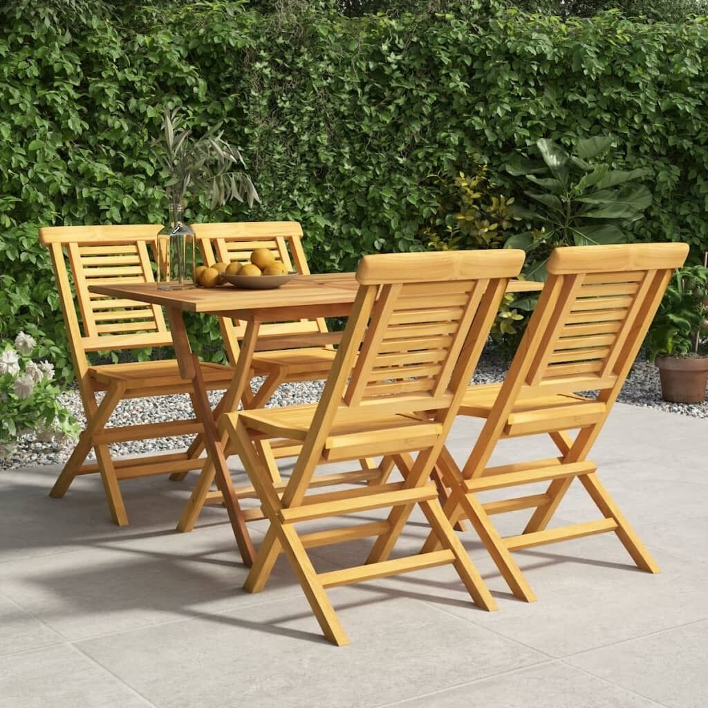 $536.60Relax and enjoy a lovely afternoon tea and meals with your family and friends with this classic wooden garden dining set! Solid teak wood: The dining set is made of solid teak wood. Solid teak wood is a beautiful natural material. It has been seasoned, kiln dried and then fine sanded to give a very smooth appearance. Teak wood is known for its exceptional strength and weather resistance.Foldable function: The outdoor dining set can be folded to save space when not in use.Comfortable experience: The backrest of the garden dining chair gives you excellent support, providing an optimal comfortable experience.Sturdy tabletop: The sturdy tabletop of the dining table is perfect for placing meals, drinks, vases, fruit bowls, or other decorative items.Parasol hole: There is a parasol hole in the tabletop so you can easily attach a parasol to create a shady spot.Slatted design: The outdoor dining chair designed with a slatted design looks simple and timeless. Note:To make sure your outdoor furniture stays beautiful, we recommend protecting it with a waterproof cover.