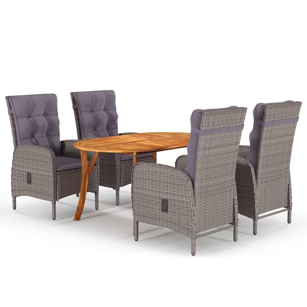 Create a compelling and cohesive aesthetic in your outdoor space with this garden dining set! This outdoor table is made of solid acacia wood, making it sturdy and stable. The oil-finished surface also makes the table easy to clean with a damp cloth. Additionally, the curved legs contribute to its stylish design. Featuring a steel frame covered with weather-resistant PE rattan, these dining chairs are sturdy and easy to clean. The thickly padded cushions add comfort in your lounging time. Note: In order to extend the life of your outdoor furniture, we recommend you to clean it regularly and do not leave it outdoors without protection unnecessarily.Clean: Use a mild soap solutionStoring: If possible, store in a cool, dry place indoors. If the product is stored outdoors, protect it with a waterproof cover. Wipe and dry the excess water or snow from flat surfaces after a rain or snowfall. Allow sufficient air circulation to avoid moisture-related damage.