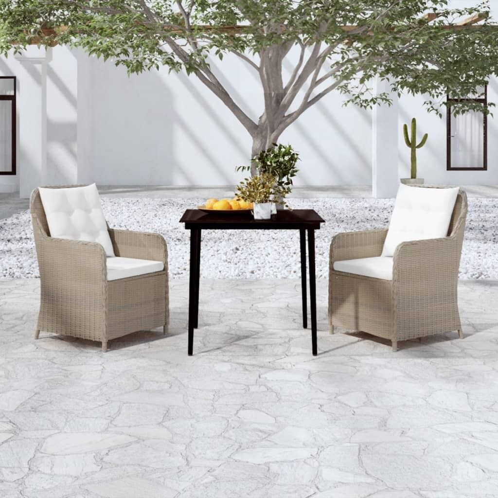 $590.54Enjoy a nice meal or afternoon tea in your outdoor space with this garden dining set! Featuring an elegant design, it will become the focal point of your garden and patio! The practical outdoor dining set has a steel frame, making it strong and sturdy. The garden chairs are made of water-resistant and maintenance-free PE rattan, making them perfect for outdoor use. The ergonomically-designed shape and thickly-padded, removable cushions with foam filling will provide the ultimate seating comfort. The low-maintenance polyester cushion and pillow covers can be easily removed and washed. In addition, the smooth glass tabletop is easy to clean with a damp cloth and excellent for placing meals, drinks and other decorative items. Note: In order to extend the life of your outdoor furniture, we recommend you to clean it regularly and do not leave it outdoors without protection unnecessarily.Clean: Use a mild soap solution.Storing: If possible, store in a cool, dry place indoors. If the product is stored outdoors, protect it with a waterproof cover. Wipe and dry the excess water or snow from flat surfaces after a rain or snowfall. Allow sufficient air circulation to avoid moisture-related damage.