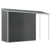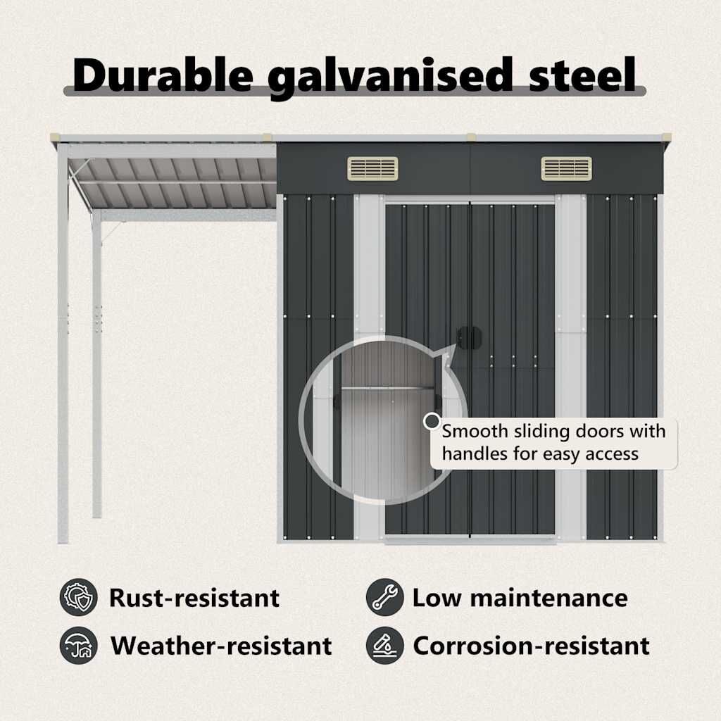 $346.84This sturdy garden shed, standing out with an extended roof, is perfect for storing a wide variety of items like tools, garden furniture, garden equipment, and more. Robust material: The garden tool shed is made of galvanised steel, which prevents rusting and endures long-time use. Steel is an exceptionally hard and strong material. It offers sturdiness and stability. Galvanisation provides better protection against corrosion and is useful for products that'll be used outdoors as well as in harsh environments.Ample storage space: This metal shed offers plenty of room to store your firewood, garden tools, furniture, equipment, and more. It also has an extended roof for storing firewood. The roof can be fixed on either side of the shed.Convenient handles: The storage shed features handles on the door for easy entry.Good ventilation: The outdoor shed is equipped with 2 air vents, providing ventilation to reduce the accumulation of moisture and odour in the house.Sloping design: The sloping roof ensures unimpeded drainage of water.
