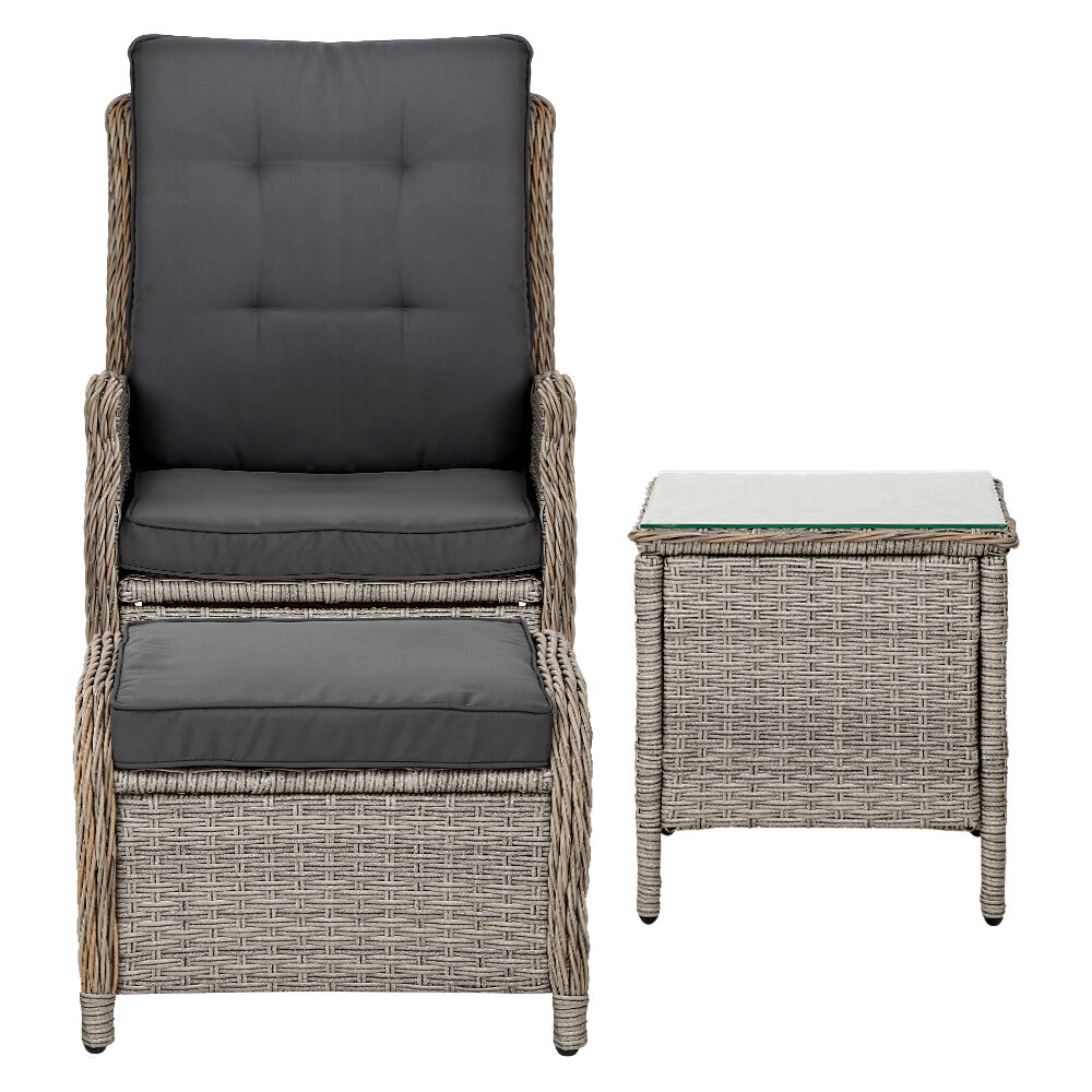 Now you can really sit back and chill in the outdoors with the Gardeon Wicker Recliner Set. Comprising two oversized recliners, two matching ottomans and a handy side table, the outdoor ensemble is everything you need for relaxation in elegant wicker style. The set is made of UV-resistant and weather-resistant PE wicker so that you never have to worry about rust, corrosion or weathering issues. The heavy-duty powder-coated steel frame is sturdy and hardy and will stand up to robust use easily. More importantly, the recliner has an adjustable backrest to suit your angle of rest. Better still, the seat cushion is made of high-density foam for ultra-comfort while the zipped cover is weather-resistant, removable and washable. Not least, the useful ottoman is just perfect for putting your feet up as you sip your latte or Bordeaux placed next to you on the tempered glass top side table. Yes, it is indeed paradise under the sun, moon and stars. Have it outdoors or indoors, the wicker recliner set is equally at home with its exquisite design and unique presence for any home décor enthusiast.