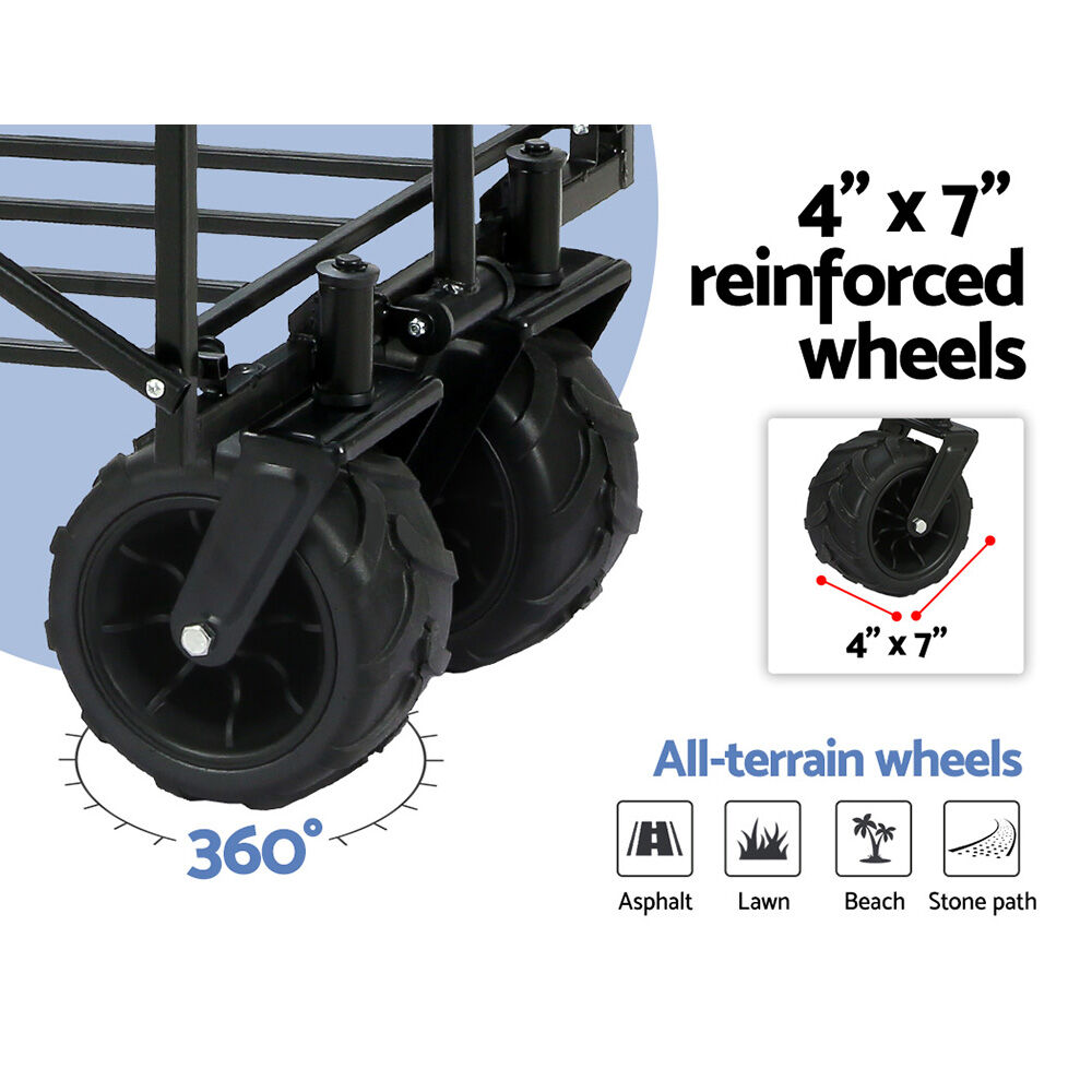 $99.89Looking for an easy way to move heavy goods and objects from one place to another? Gardeon has got you covered with the foldable garden cart. Whether you want to transport large pot plants, mulch, rocks, gardening tools, and other supplies around your yard or use it for shopping groceries, this garden cart has been designed for versatile use. You can use it in your garden or carry it along for shopping, camping, fishing, and much more. Crafted from solid steel frame and 600D double-layer polyester fabric, our garden cart is sturdy and durable. It has a good weight holding capacity and can withstand rough and tough use. The polyester fabric can be removed for washing and cleaning. Furthermore, it has 360? rotating front wheels for easy movement. The wheels are designed to move smoothly on asphalt, lawn, stone path, and beach. So take it everywhere you go. You can even adjust the handle for your convenience, and the foldable and compact design enables you to store properly until the next use. Shop our Gardeon trolley cart today and never regret.