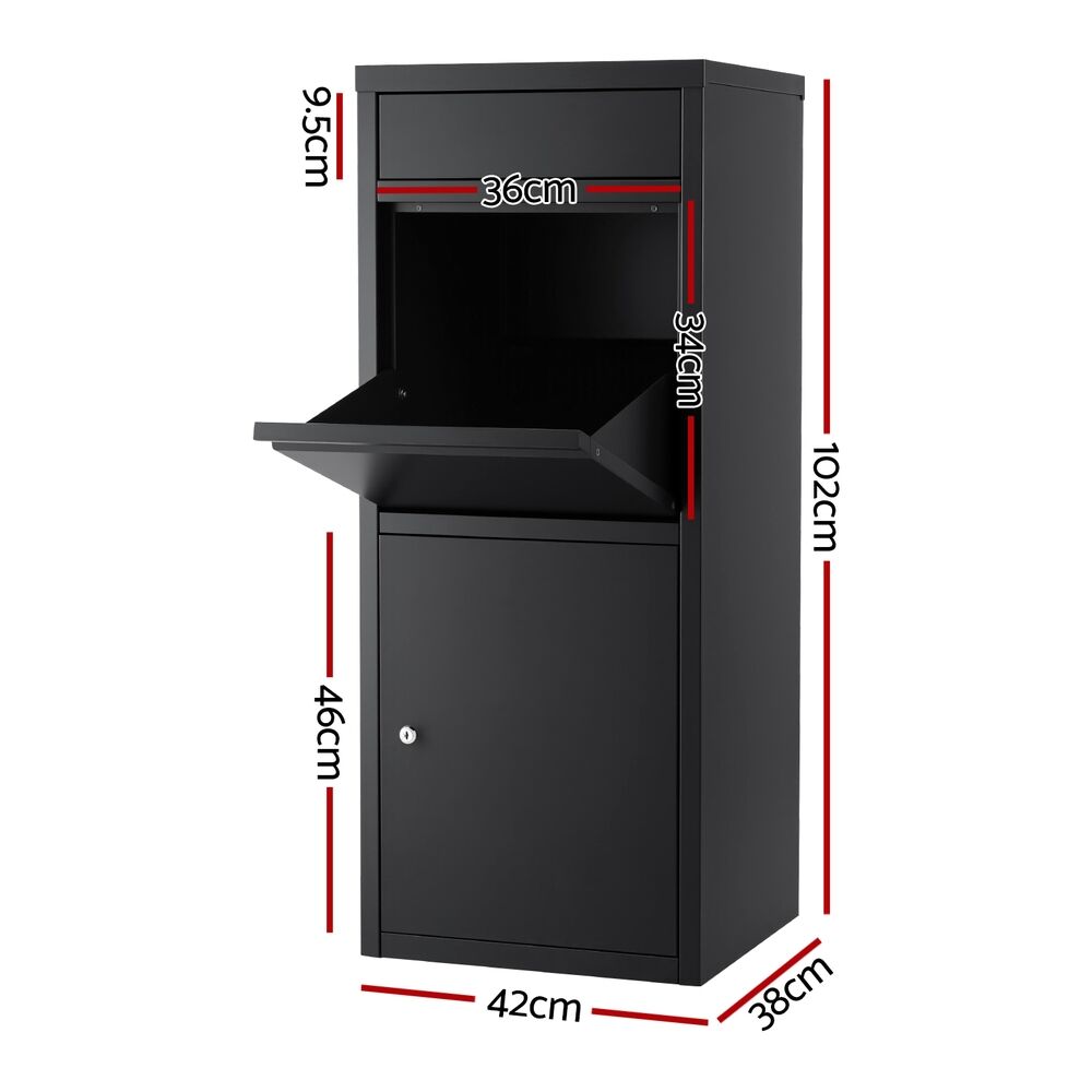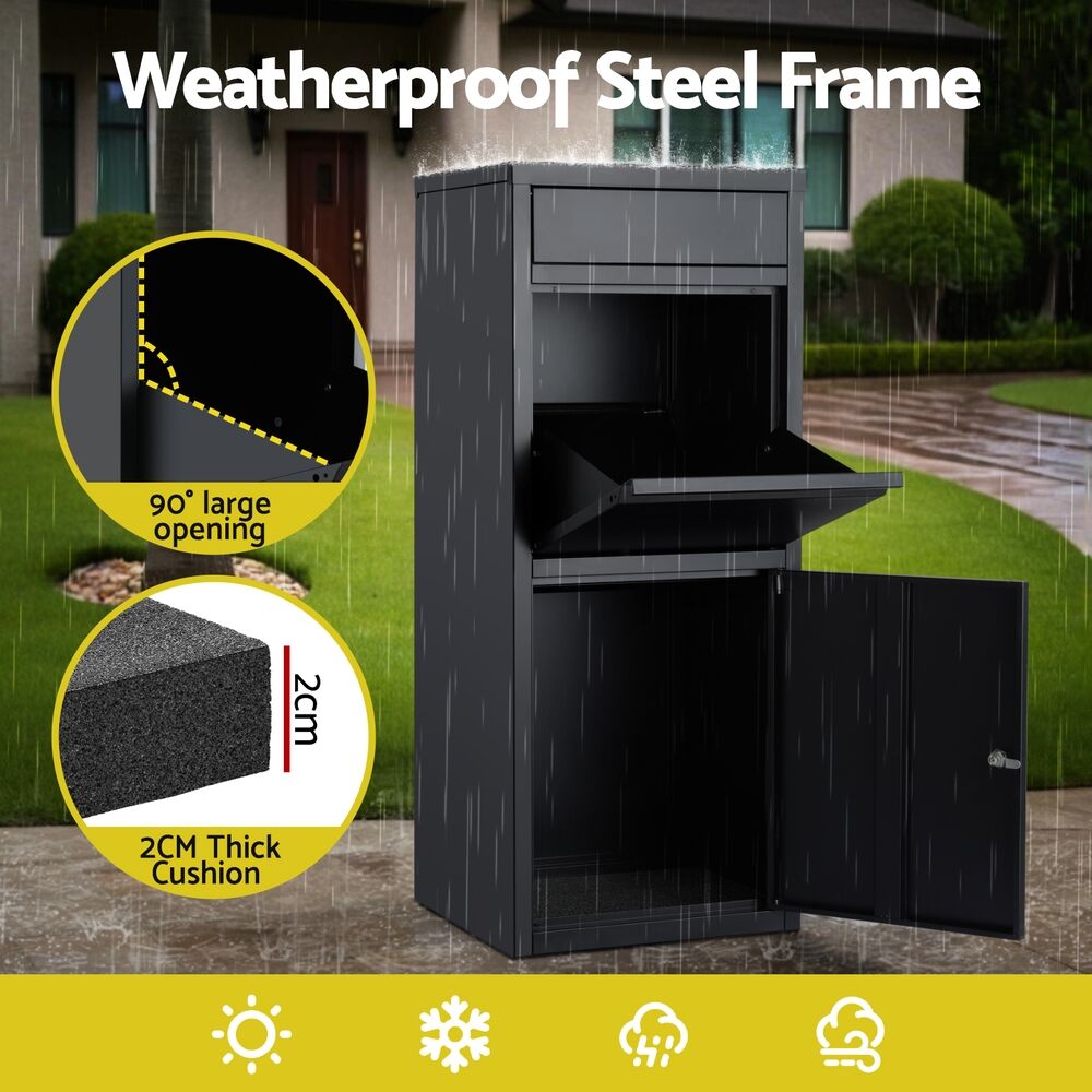 Heavy-duty weatherproof steel frame withstands Aussie elements. Features 2 slots drop design for mail + parcels with 90° large opening for bulky items. Secured locked cabinet includes 2 keys for safe collection. Large storage capacity with soft bottom cushion (2cm thick) protecting deliveries. Ideal for driveways or porches.