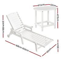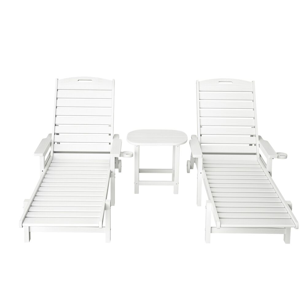 Upgrade your outdoor relaxation with the Gardeon 3-Piece Set! This versatile combo includes two 4-position adjustable chaise lounges and a durable HDPE side table, perfect for poolside, patio, or beach use. The lounges feature reclining backrests for sunbathing, reading, or napping, with 150kg weight capacity, weatherproof HDPE wood-grain construction, and stainless steel frames. Effortlessly move them with rolling wheels and handles. The matching side table is fade-resistant, supports 91kg, and includes water-draining slats and safety-curved edges. Zero maintenance��just wipe clean! Quick assembly lets you enjoy instant comfort. Ideal for stylish, hassle-free outdoor living!