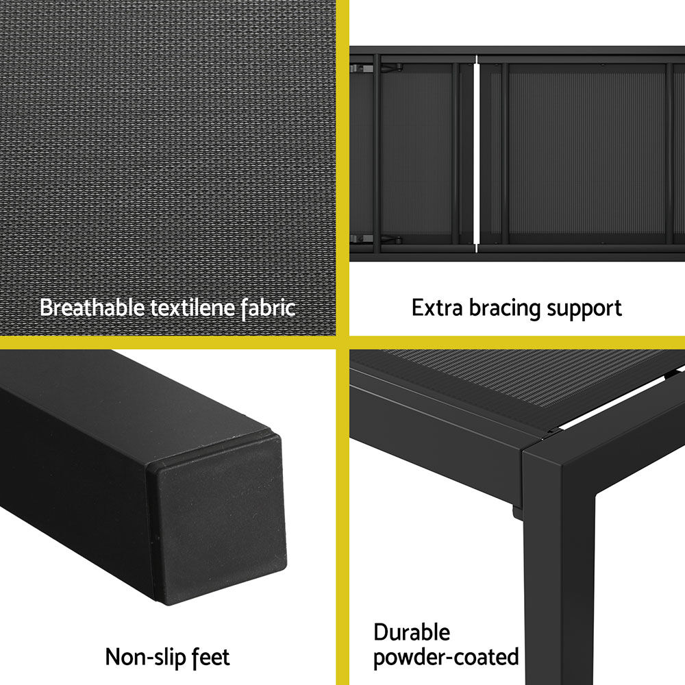 $160.88Make the most out of every sunny day with a Gardeon Sun Lounger. Made from breathable textilene fabric on a strong powder-coated aluminium frame, the lounger is sturdy and resistant to weather and corrosion. Non-slip feet and extra bracing support keeps the chair upright and stable with a 150kg weight capacity. 5 adjustable backrest settings offer you the perfect position to rest and relax. Smooth wheels make the chair easy to move and chase the sun. Best of all, the lounger is easily assembled and can be used anywhere such as the beach, the park, poolside or even indoors. Have more fun in the sun with a Gardeon Sun Lounger.