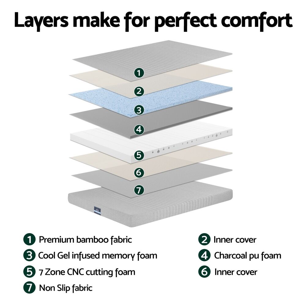 Foam Material: Cooling gel-infused memory foam, charcoal PU foam,7 Zone CNC cutting foam